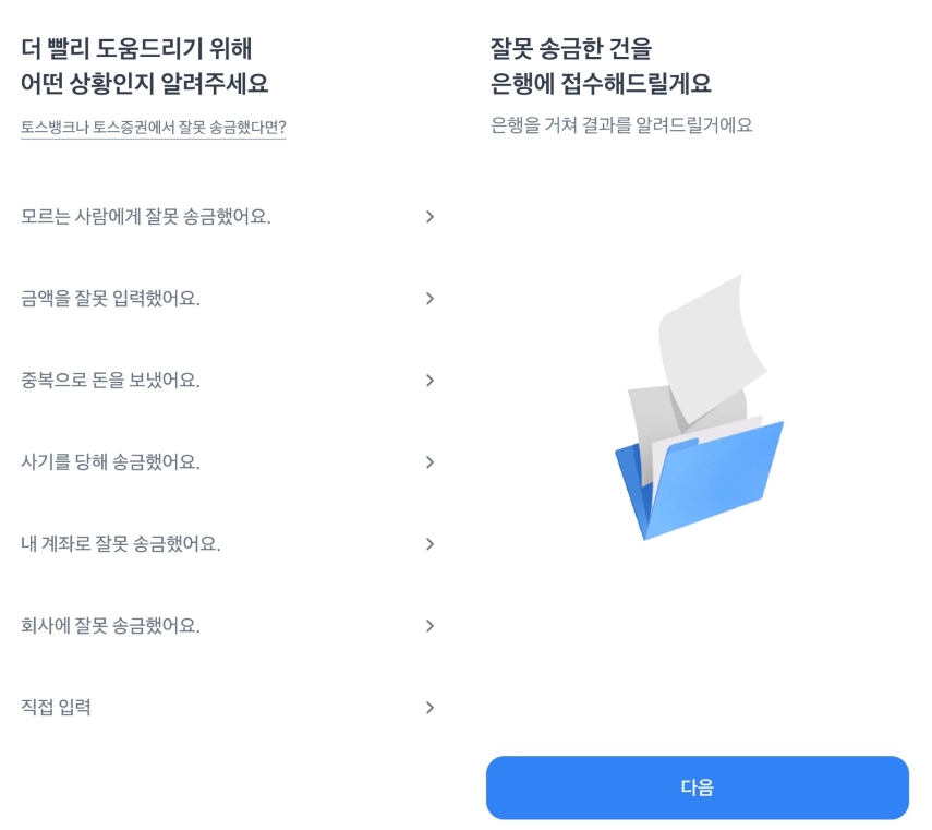 앱 하단 우측 전체탭을 선택 후 고객센터를 클릭 하고 "잘못 송금했어요" 탭 클릭 후 접수하시면 됩니다.