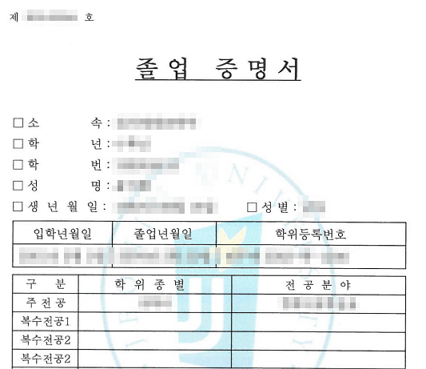 - 학교에서 졸업 증명 회신을 받으면 동사무소에서 확인 날인 후 졸업증명서(최종학력증명서) 발급