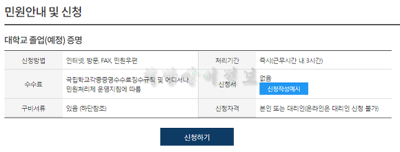 - 대학교 졸업(예정) 증명 : 대학(교) 정보 입력(학교 검색/전공학과 기입) >> 발급 부수/수령 기관 선택 >> 민원 신청하기 >> 서비스 신청내역에서 결과 확인 가능