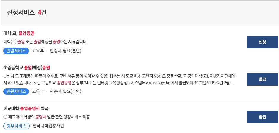 - 신청 서비스에서 '대학(교) 졸업증명' '초중등학교 졸업(예정) 증명' '폐교 대학 졸업증명서 발급' 중 택일