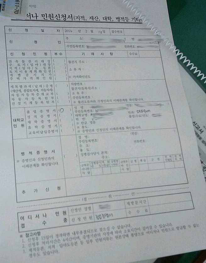 - 최종학력증명서 동사무소 발급 신청 : 동사무소 방문(신분증 필수 지참) >> '다른 행정기관 등을 이용한 민원사항 신청서' 작성 후 제출 >> 발급