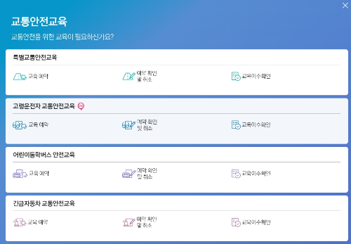 [특별교통안전교육] [고령운전자 교통안전교육] [어린이통학버스 안전교육] [긴급자동차 교통안전교육] 이렇게 4가지의 교통안전교육을 받으실 수 있습니다.