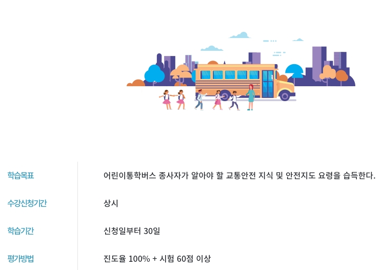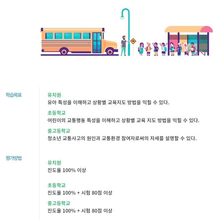 어린이 통학버스 안전교육은 어린이의 통학에 이용되는 자동차 등(어린이통학버스)의 종사자를 대상으로 업무구분별 역할과 안전수칙, 어린이의 통학버스 승·하차 안전에 대하여 온라인 교육을 시행함으로써 교통질서를 제고하고 어린이 교통사고를 예방하기 위해 제작되었습니다.