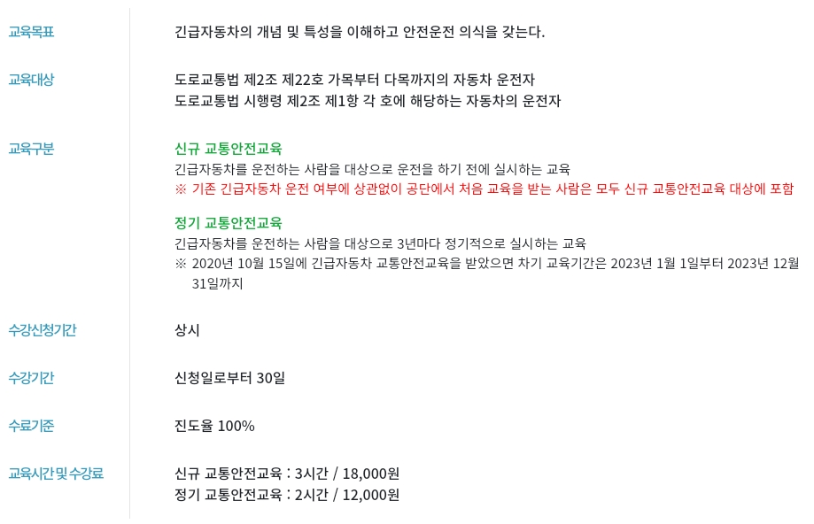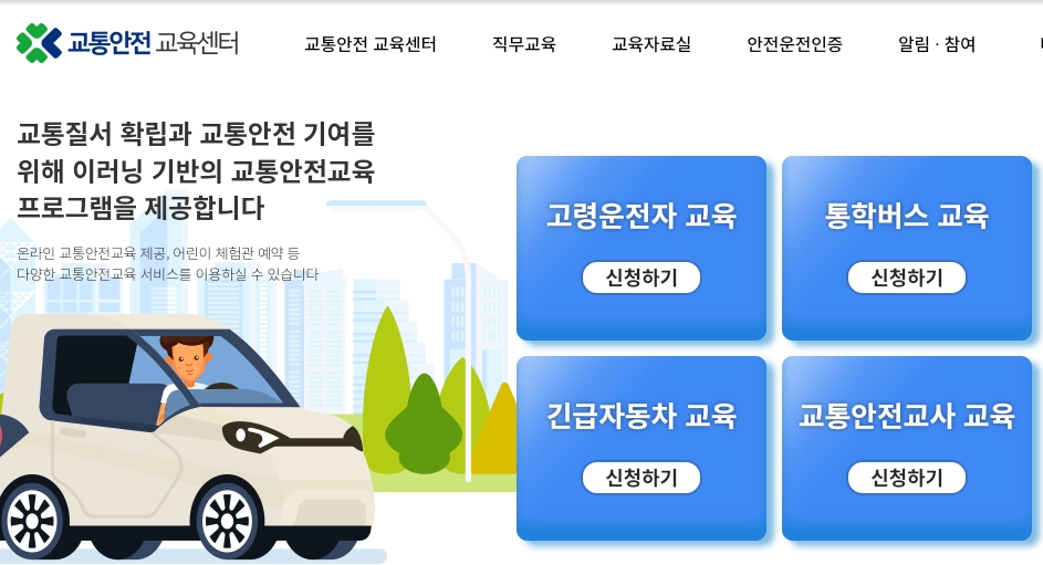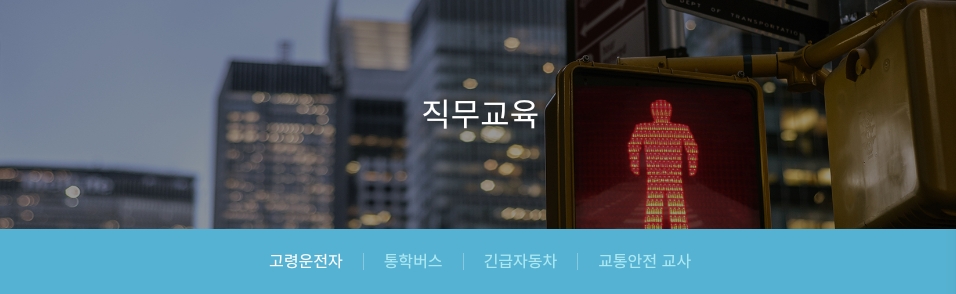 교통질서 확립과 교통안전 기여를 위해 이러닝 기반의 교통안전교육 프로그램을 제공하고 있습니다. 직무교육으로는 [고령운전자 교육] [통학버스 교육] [긴급자동차 교육] [교통안전교사 교육] 이 있습니다.