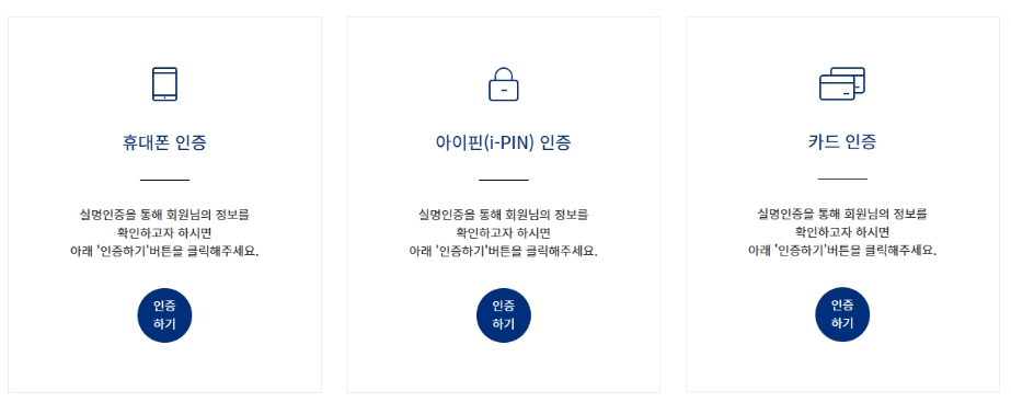 2) 휴대폰인증 / 아이핀인증 / 카드인증 3가지 중에 한가지 방법으로 인증을 한 후 회원가입을 진행하시면 되겠습니다.