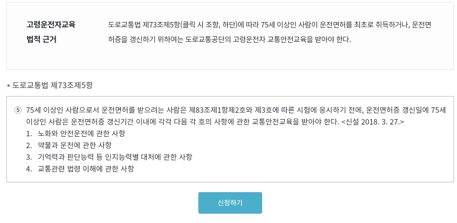 고령운전자 교육은 만 75세 이상 운전자의 운전면허 갱신(적성검사)을 위한 의무교육으로 자연스러운 노화과정에 따른 신체, 인지기능의 변화를 고려한 안전운전 방법을 습득하기 위한 것입니다. 도로교통공단 홈페이지에 접속하셔서 화면 우측을 보시게 되면 4가지의 신청하기가 나옵니다. [고령운전자교육] [통학버스교육] [긴급자동차교육] [교통안전교사교육] 오늘은 [고령운전자교육]에 대해서 알아보겠습니다.