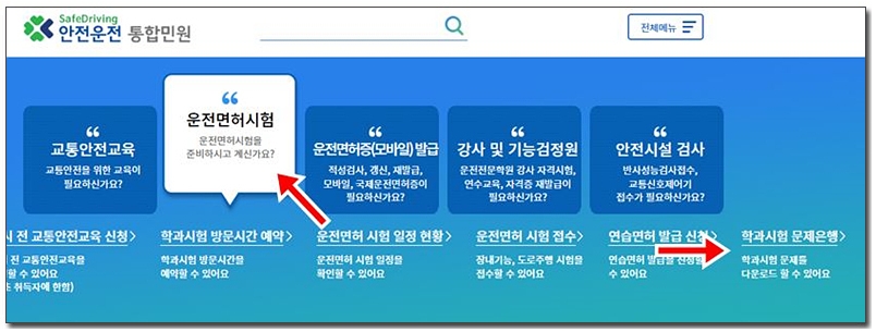 2) 도로교통공단 안전운전 통합민원 홈페이지에 접속하셔서 [운전면허시험]을 클릭한 후 맨 우측에 보시면 [학과시험 문제은행]에 접속합니다.