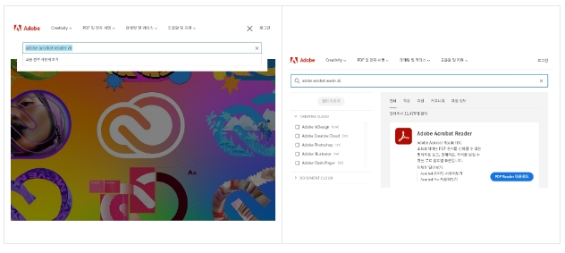 2) 어도비 홈페이지에 접속해서 우측 상단 돋보기 모양을 클릭 후 [adobe acrobat reader dc]라고 검색을 합니다.
