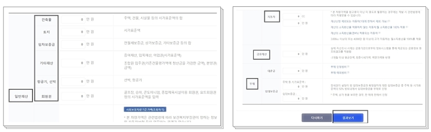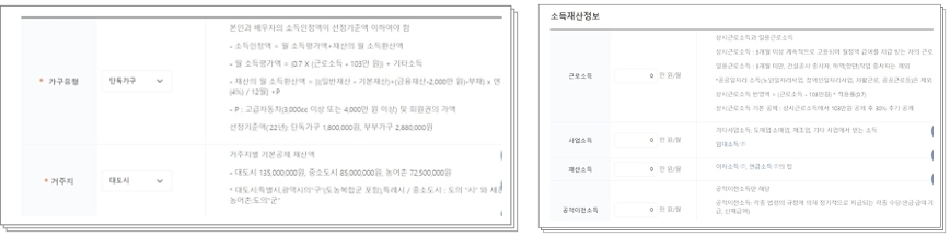2) 가구 유형을 선택하세요.(단독가구, 부부가구) 그 후 거주지, 근로소득, 사업소득, 재산소득, 공적이전소, 건축물, 토지, 임차보증금, 기타재산, 항공기, 선박, 회원, 자동차, 금융재산, 부채를 모두 입력합니다.