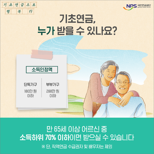 기초연금 대상은 만 65세 이상의 국민 중 소득 하위 70% 를 대상으로 지급을 합니다.