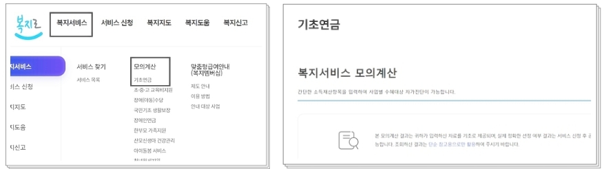 1) 복지로 홈페이지에 접속합니다. 접속 후 상단에 [복지서비스] -> [모의계산] -> [기초연금] 을 클릭합니다.