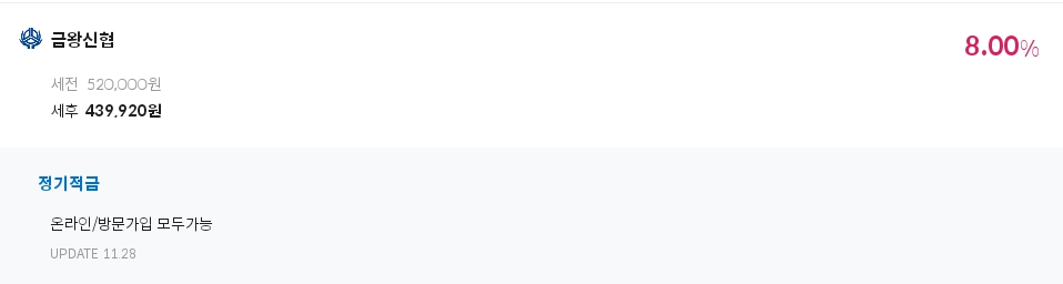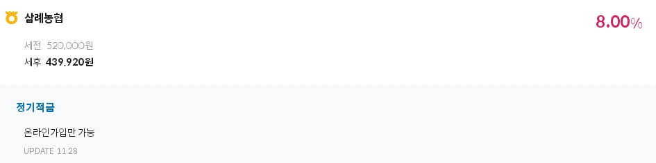- 월 100만원 12개월 정기적금 시 -> 세전 520,000원 -> 세후 439,920원