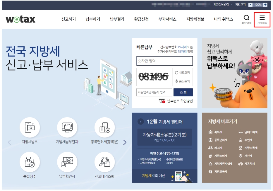 - 홈페이지 접속 -> 로그인 -> 우측상단(전체메뉴) -> 부가서비스 -> 자동차세 연납 신청
