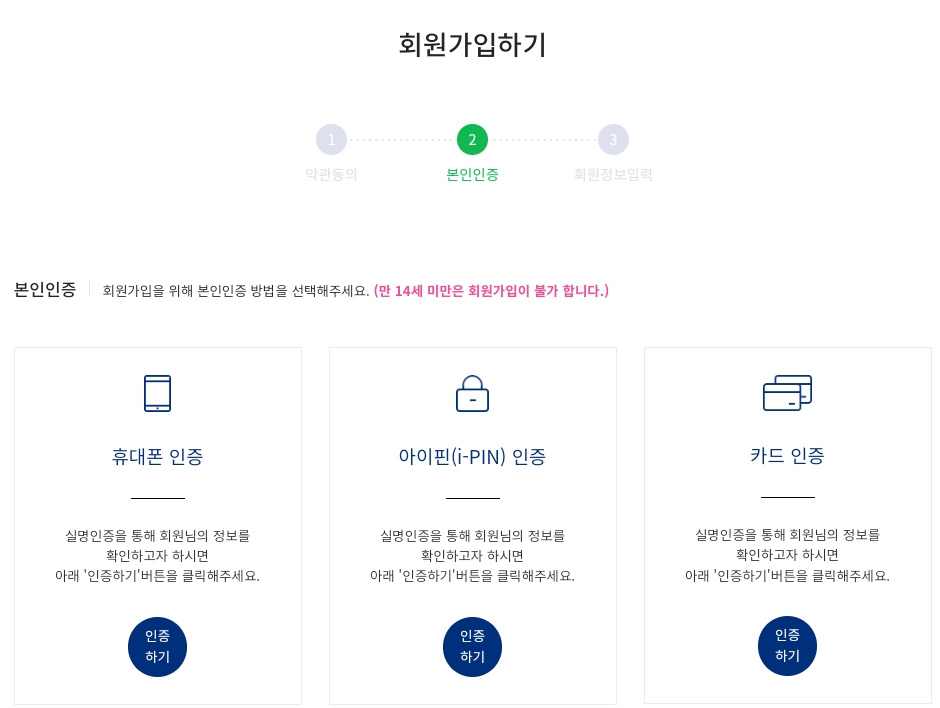 2) 메인화면 우측 상단에 보이는 [회원가입]을 클릭합니다.(휴대폰 인증, 아이핀 인증, 카드 인증을 통해 가입 가능)