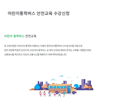어린이통학버스 안전교육 과정은 어린이의 통학에 이용되는 자동차 등(어린이통학버스)의 종사자들 대상으로 업무구분별 역할과 안전수칙, 어린이의 통학버스 승하차 안전에 대하여 온라인 교육을 시행함으로써 교통질서를 제고하고 어린이 교통사고를 예방하기 위해 제작되었습니다.