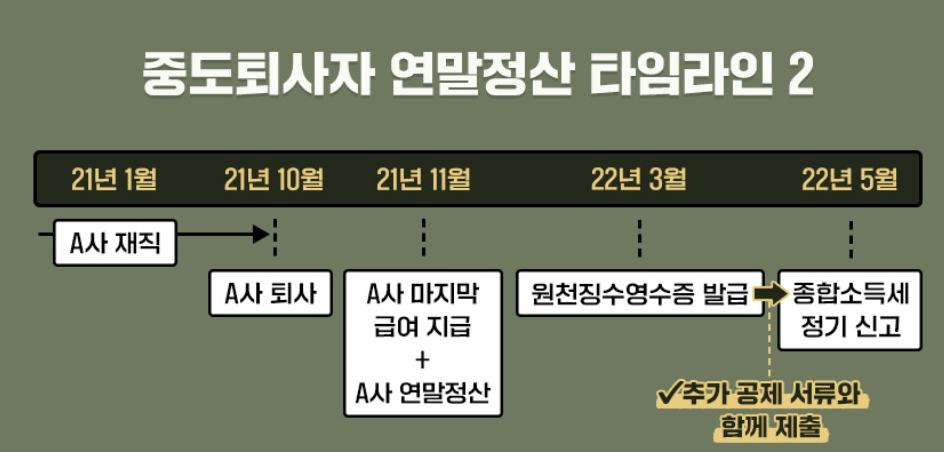결국 회사에서는 12월31일 퇴사자에게 해당 일을 기점으로 중도퇴사자 연말정산을 종료하고 5월 종합소득세 신고를 하는 방향으로 안내하는 것이 대부분입니다.