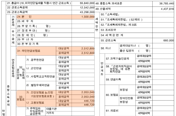 중도퇴사자의 근로소득 원천징수영수증을 살펴보면 본인공제 및 연금보험료, 건강보험료, 장기요양보험료, 고용보험료 등 기본공제만 적용하고 추가 공제 자료에 대해서는 반영이 되지 않은 상태로 연말정산이 완료됩니다.