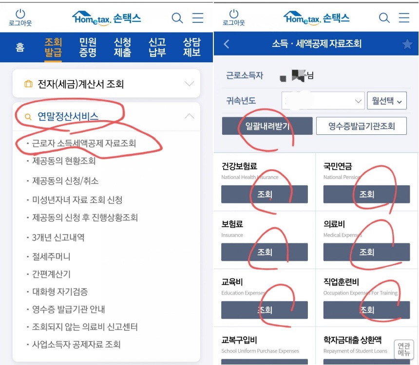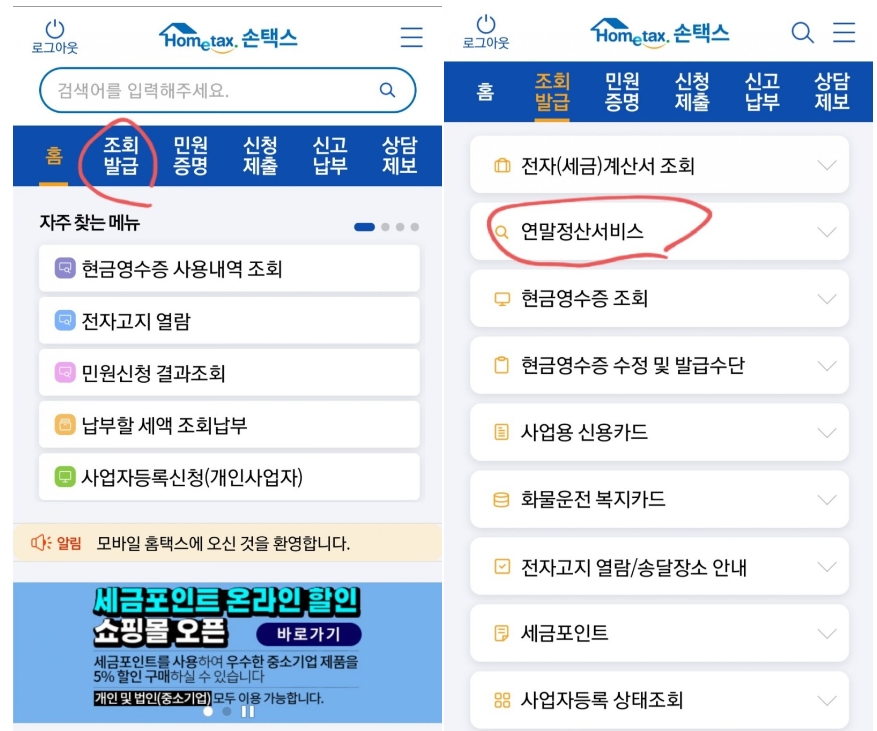 1) 모바일 홈택스(손택스)에 로그인하셔서 조회발급을 누르신 후 연말정산 서비스를 누르세요.