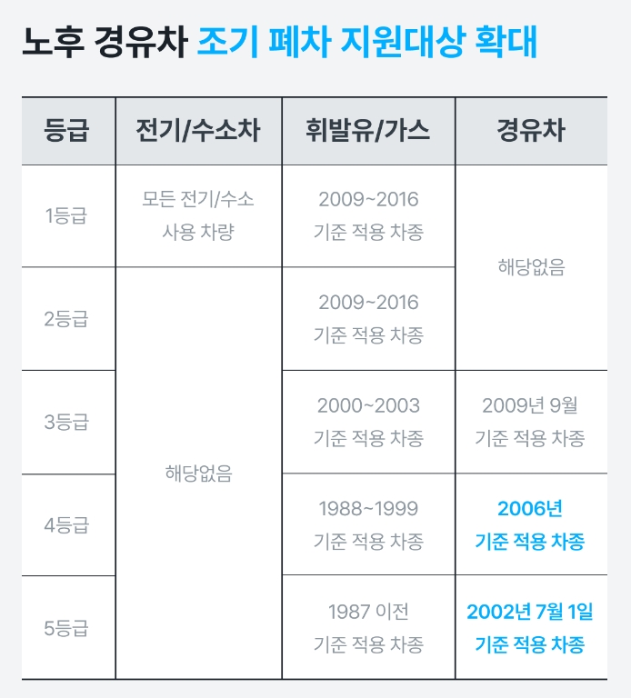 오래된 경유차를 소유하신 분들이라면 주목하셔야 합니다. 2023년에 노후 경유차의 조기폐차 지원대상이 확대되었습니다. 노후 경유차 조기폐차 사업은 대기오염 배출원인 노후 경유차를 근본적으로 줄여나가는 사업으로 2023년에는 자동차배출 가스 4등급 차종까지 확대되었습니다.