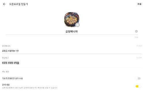 3) 오픈 프로필로 활용할 사진을 넣어주시고 이름을 수정하시면 됩니다. 상태메시지, 관심태그는 넣고 싶으시면 넣으시면 됩니다.