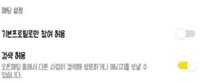4) [기본프로필만 참여 허용]을 체크하면 내가 운영하는 오픈 채팅방에선 상대방은 기본 프로필만 참여할 수 있는 설정입니다. [검색 허용]을 켜면 검색을 통해 나의 오픈 채팅을 검색해서 찾을 수 있는 설정입니다.