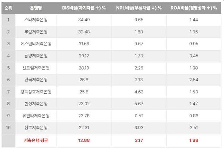 스타저축은행, 부림저축은행, 에스엔티저축은행, 남양저축은행, 센트럴저축은행, 민국저축은행, 평택상호저축은행, 한성저축은행, 유안타저축은행, 삼호저축은행이 순위안에 있으며 순위는 변동됩니다.