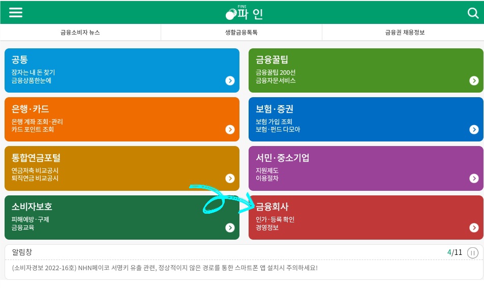 2) 파인 홈페이지에 접속하셔서 우측 하단에 [금융회사]를 클릭합니다.