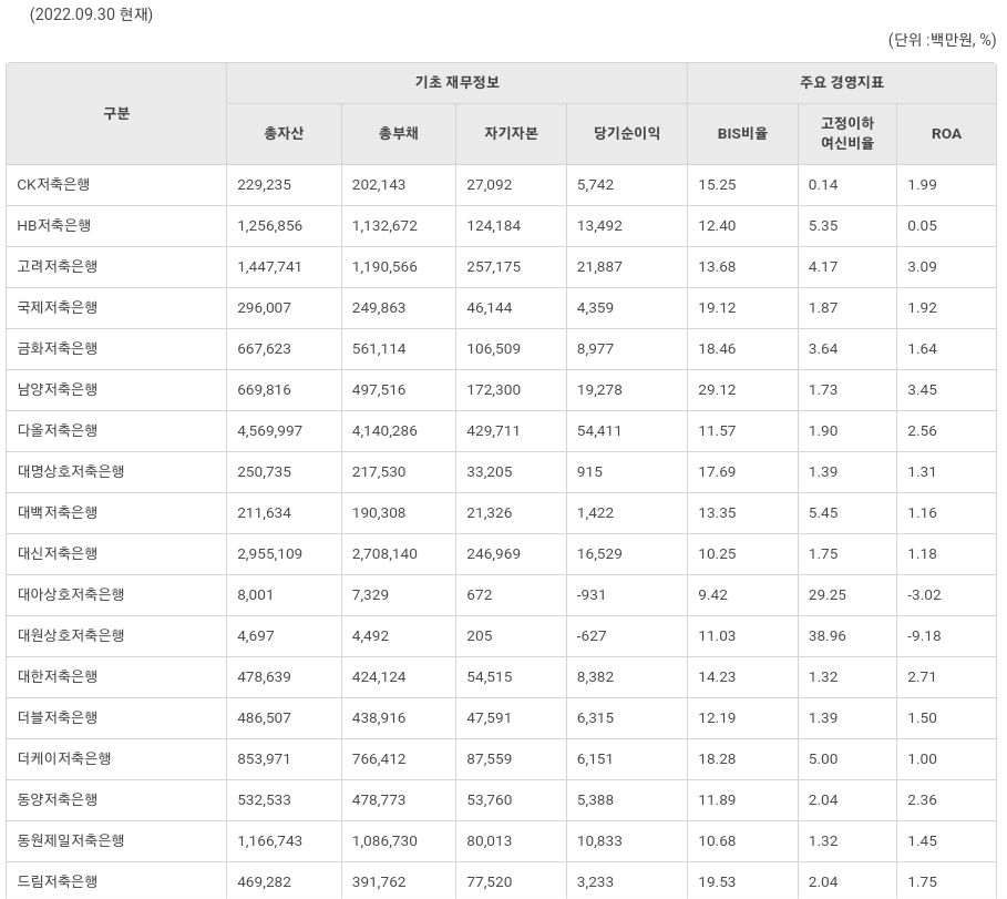 5) 아래 에 보면 79개의 저축은행에 대한 [총자산] [총부채] [자기자본] [당기순이익] [BIS비율] [고정이하여신비율] [ROA] 가 나옵니다.
