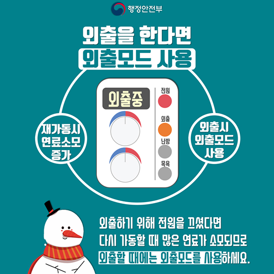 보통 외출 하실때 보일러가 계속 돌아갈까봐 꺼놓고 나가시는 경우가 많습니다. 보일러를 꺼놓고 집안이 냉골이 된 후 다시 집에와서 보일러를 틀면 적정온도로 올라가기 위해서 더 많은 난방비가 듭니다. 그렇기에 외출모드로 설정을 해서 난방비를 절약해보시기 바랍니다.