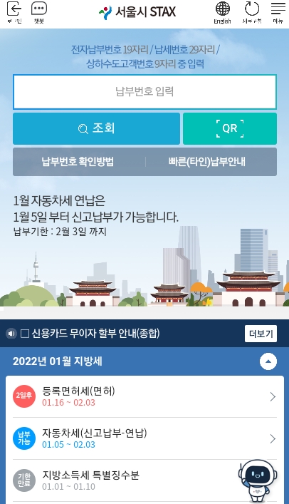 - 서울시에서는 온라인 "이택스"와 앱 "스택스"에서 2022.1.5(수) ~ 2.3(목)까지 신청기간입니다.