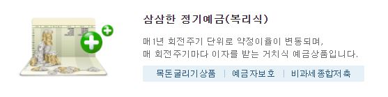 - 인터넷 가입이 가능하며 매 1년 회전주기 단위로 약정이율이 변동되며, 매 회전주기마다 이자를 받는 거치식 예금상품