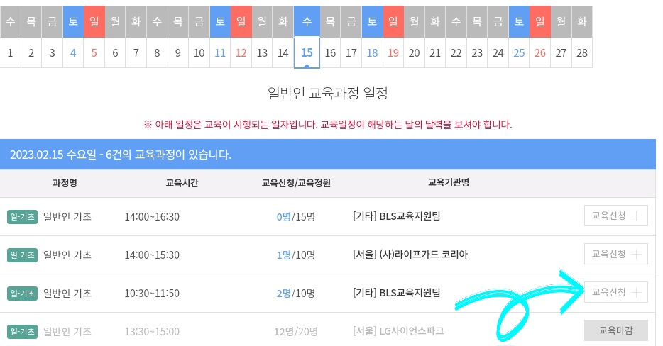 4) 내가 원하는 날짜를 선택해서 내가 받고 싶은 곳에 교육을 신청합니다.