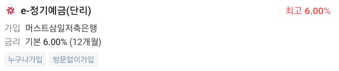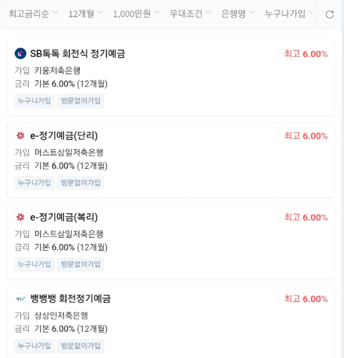 - Ex) 최고금리순 / 12개월 / 1,000만원 / 우대조건(전체) / 은행(전체) / 누구나가입