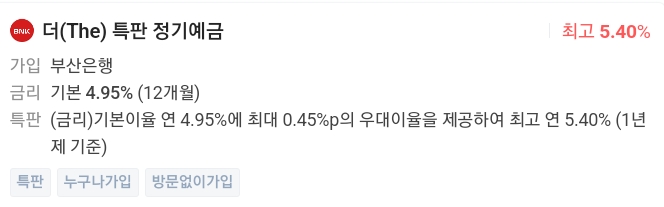 - (금리) 기본이율 연 4.95%에 최대 0.45%p의 우대이율을 제공하여 최고 연 5.40%(1년제 기준) (조건) 판매 기간에만 가입 가능한 특판 전용 정기예금