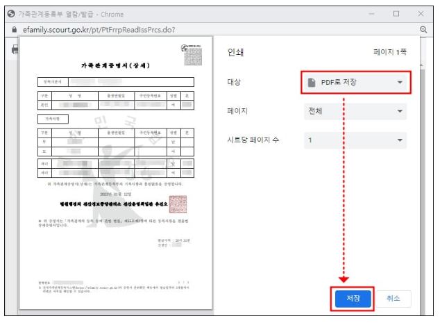 11) 가족관계증명서 인터넷 발급할 때 인쇄 대상을 프린터로 설정하면 바로 출력할 수 있고, 파일 형식으로 제출할 용도라면 PDF로 저장하면 됩니다. 집에 프린터가 없다면 PDF로 저장 후 나중에 출력하는 것도 하나의 방법입니다.