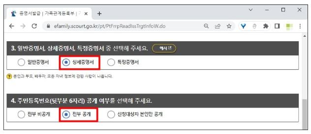 6) 가족관계증명서는 일반증명서, 상세증명서, 특정증명서 중 하나를 선택해야 합니다. 일반증명서는 현재의 가족관계에 관련된 필수정보만 나오며, 상세증명서는 본인과 부모, 배우자, 모든 자녀에 관한 사항이 전부 기재됩니다.