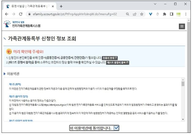 2) 가족관계등록부 신청인 정보 조회 화면이 나오면 이용약관에 동의합니다. 집에 있는 프린터에서 출력하려면 테스트 증명서 출력으로 프린터의 정상 출력 여부를 확인하면 됩니다.