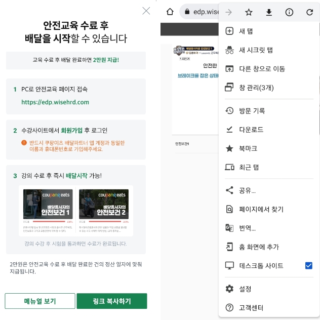 쿠팡 안전보건교육에 들어가셔서 [쿠팡이츠 배달파트너 앱 계정과 동일한 이름과 휴대폰번호로 가입]하신 후 교육을 들으시면 되는데 쿠팡에서는 PC에서 교육을 들으라고 하지만 귀찮으신 분들은 [삼성인터넷]이나 [크롬]에서 아래 사진에서 보시는거와 같이 [데스크톱 사이트]라고 PC로 변환시킨 후 안전교육을 들으시면 핸드폰으로도 교육수료가 가능합니다.