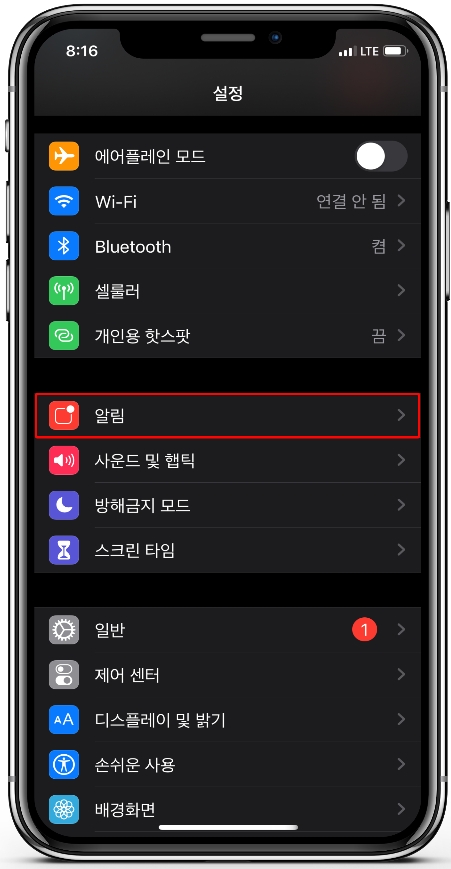 2) [설정] 에 들어가셨으면 [개인용 핫스팟] 밑에 [알림]이라고 있습니다. [알림]을 클릭하세요.