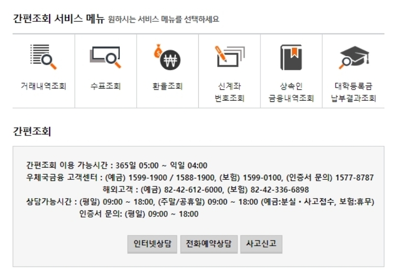 간편조회 이용 가능시간은 365일 05시부터 익일 04시까지입니다. 우체국금융 고객센터 전화번호는 위의 내용과 같으며, 상담이 가능한 시간은 평일 09시~18시까지이고 주말과 공휴일에는 09시~18시까지입니다. 인증서 문의의 경우 평일 09시부터 18시까지 이용하실 수 있습니다.