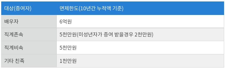 증여세 공제대상으로는 위에서 보는 표와 같으며 증여세 면제 기간은 1년으로 부모가 자식에게 5천만월 주고 내년에 5천만원을 준다면 두번째 5천만원은 증여세를 내야 하지만 첫번째 5천만원을 주고 10년 후에 다시 준다면 증여세가 면제됩니다.