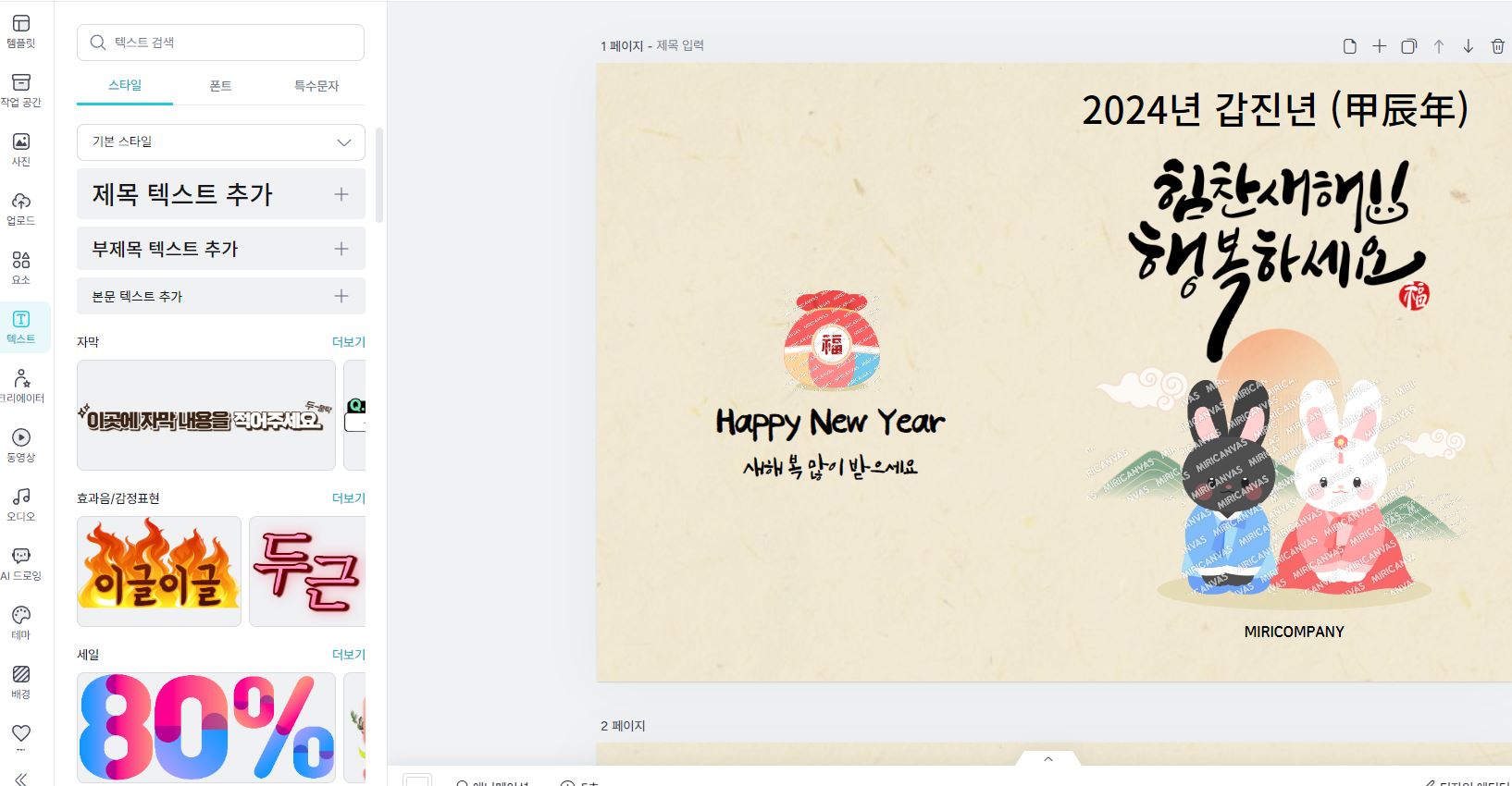 4) 임의로 하나 만들어보겠습니다. 원하는 무료 템플릿을 선택하시고 원하는대로 수정도 가능하십니다. 텍스트 파일 추가해서 [ 2024년 갑진년(甲辰年)] 문구를 넣었습니다.