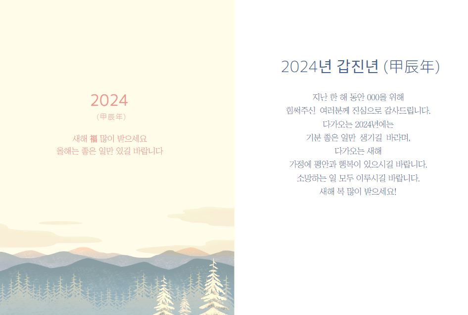 - 2024년 갑진년 새해 복 많이 받으세요. 한 해 동안 보내주신 관심과 성원에 다시 한번 감사드립니다. 2024년 새해에도 항상 건강하시고 바라던 모든 소망과 계획했던 모든 일들이 풍성한 결실로 맺어지는 행복한 한 해가 되시길 기원합니다. - OOO 올림 -