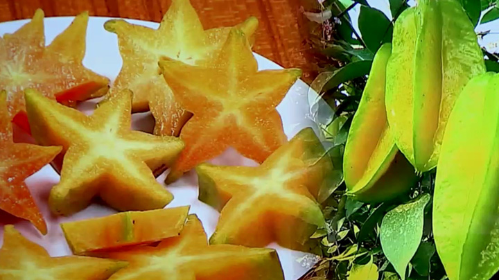 스타 프루트(Star Fruit)는 동남아시아와 카리브해 등의 열대 지역에서 흔히 볼 수 있는 열대 과일로 정글의 법칙을 널리 알려지며 국내에서 기르기도 하는데, 열매를 가로로 자르면 별 모양으로 보이기 때문에 별 과일 또는 카람볼라(Carambola)로 불리고 있습니다. 스타 프루트 열매는 수분이 풍부하고 연해서 껍질째 먹을 수 있을 뿐만 아니라 새콤달콤한 맛이 뛰어나 샐러드에 넣어 먹거나 채소류와 같이 다양한 요리에 맛과 멋을 더하는 데 활용되고 있습니다.
