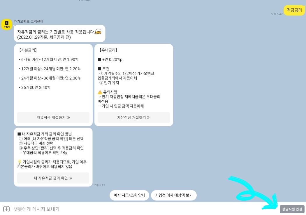 • "적금금리" 이렇게 쳤을 때 챗봇이 대답해주고 아래에 보면 "상담원 연결"이 있는데 이거 눌러주시면 실제 상담원이랑 카카오톡으로 대화가 가능합니다.