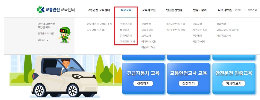 홈페이지 상단 [직무교육] 메뉴 중 [고령운전자] 직무교육을 클릭하여 이동합니다.