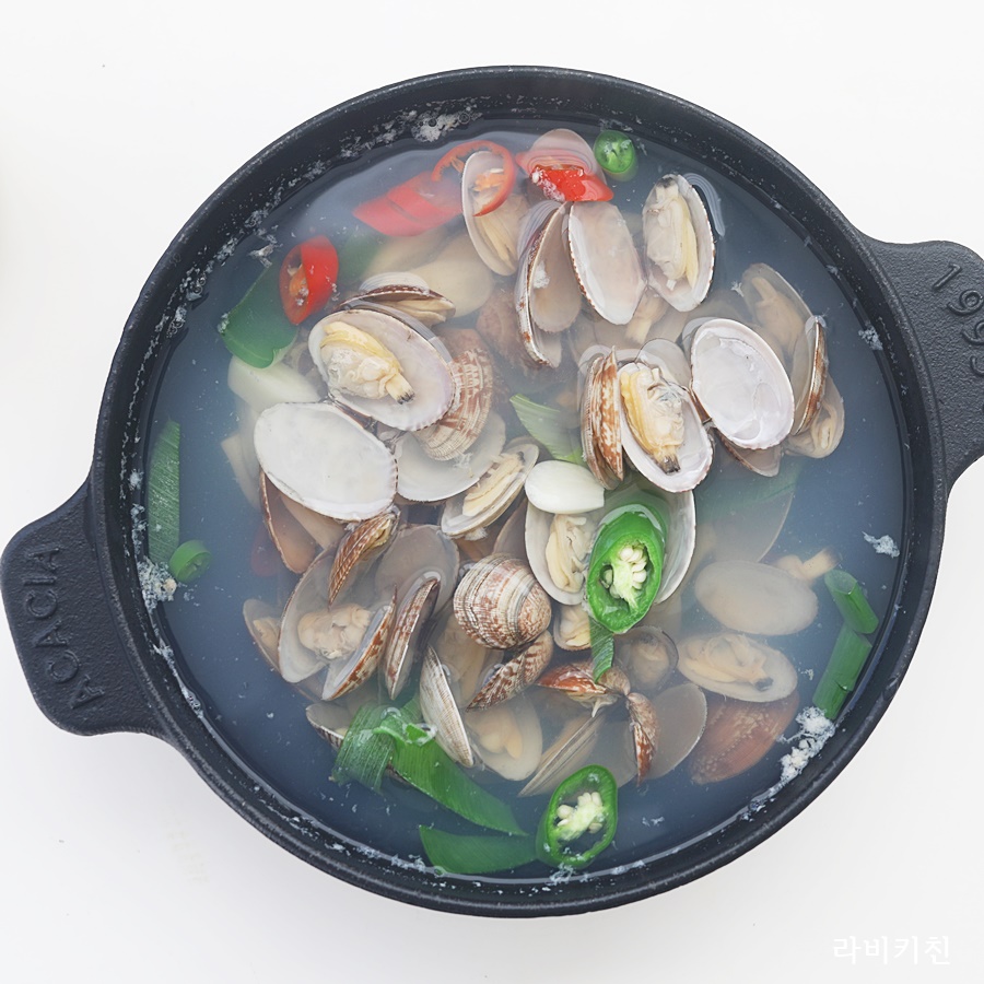 바지락은 해감을 잘못하면 음식을 망칠 수 있습니다. 바지락을 해감할 때는 먼저 깨끗한 물에 바지락을 2~3회 정도 잘 씻어준 다음, 잠길 정도로 물에 소금 2큰술을 풀어서 바지락을 담은 그릇을 신문지나 검은색 비닐봉지로 덮어 빛을 차단해 어두운 환경을 조성해 줘야 이물질을 잘 뱉어 내기 때문에 냉장실에 넣고 2~3시간 정도 뒀다가 사용하면 됩니다.