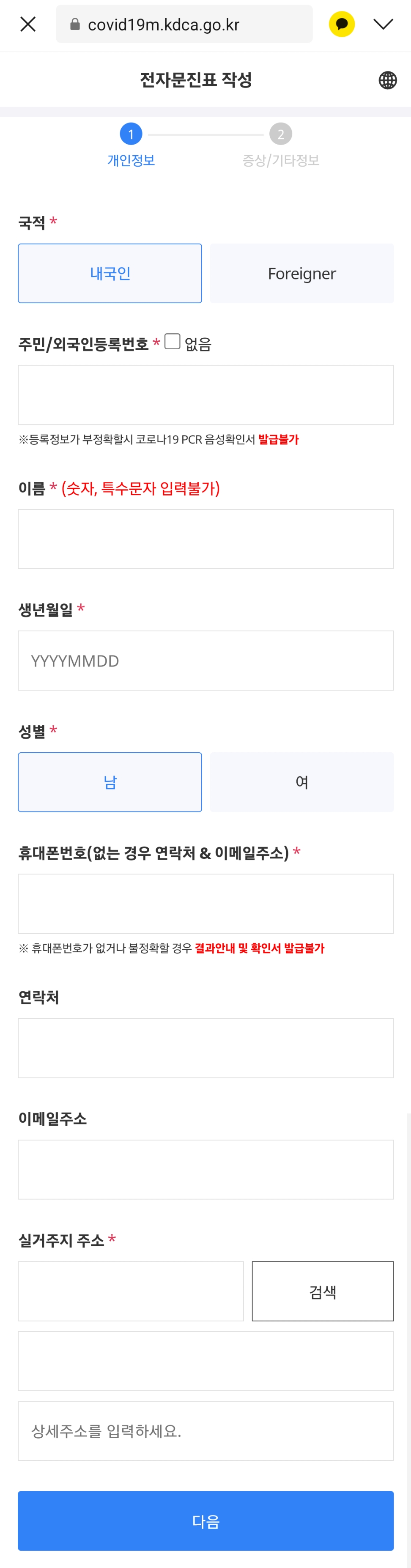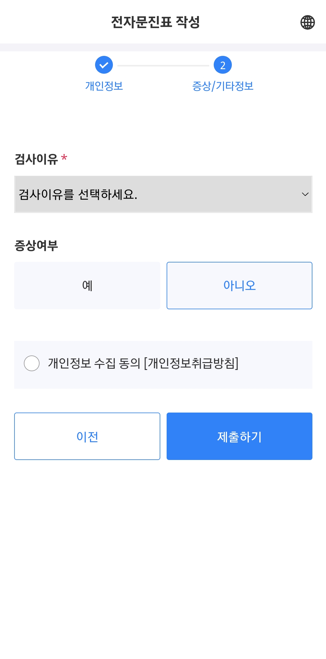 전자문진표는 국적, 주민번호, 이름, 생년월일, 휴대폰 번호, 이메일 주소, 실거주지 주소를 작성하고 검사 이유 및 증상 여부를 작성 후 제출하시면 됩니다. 그리고 신분증은 꼭 필요합니다. 꼭 꼭!!