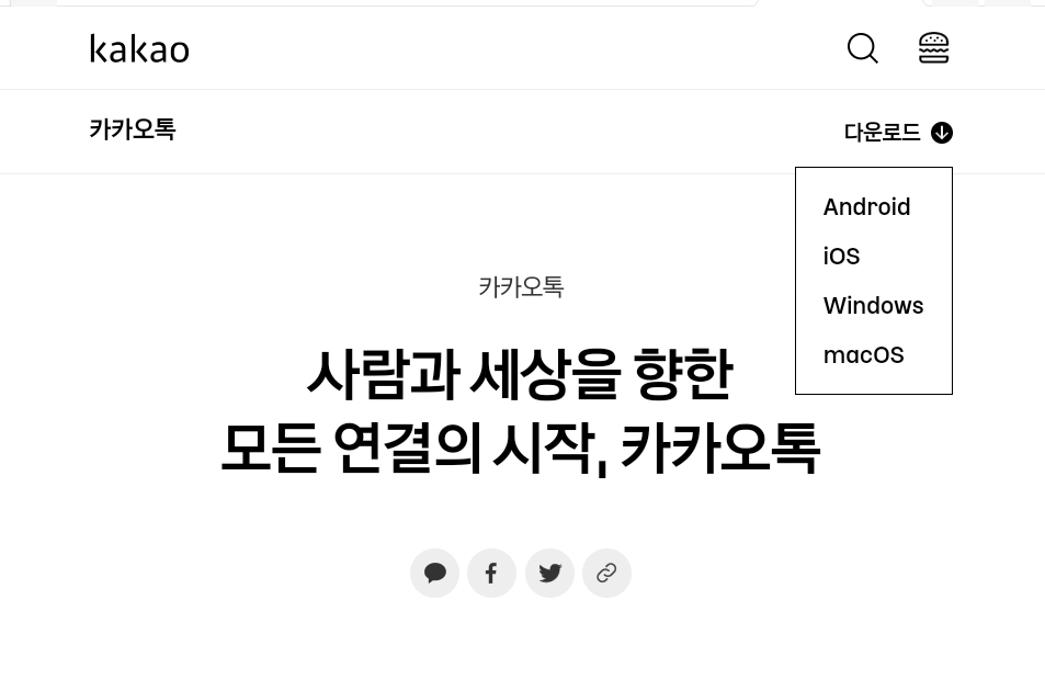 카카오톡 공식 홈페이지를 접속 후 우측 상단에 있는 [다운로드]를 클릭하셔서 다운로드 할 제품의 OS에 맞게 선택하셔서 다운로드 하시면 됩니다.