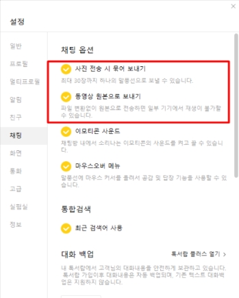 4.카카오톡으로 파일 공유 많이 하시는 분들은 [설정] -> [채팅 옵션] 에 들어가셔서 "사진 전송 시 묶어 보내기" "동영상 원본으로 보내기"를 활성화해주시면 파일을 드래그해서 카톡위에 올리기만 해도 쉽게 전송이 가능합니다.
